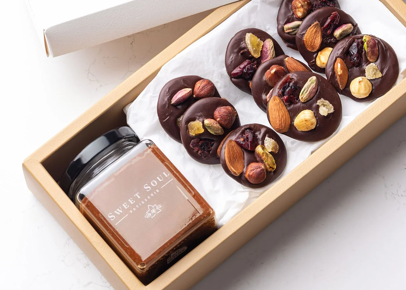 Caramel spread and nine dark chocolate mendiants with roasted hazelnuts, pistachios, almonds and dried cranberries.